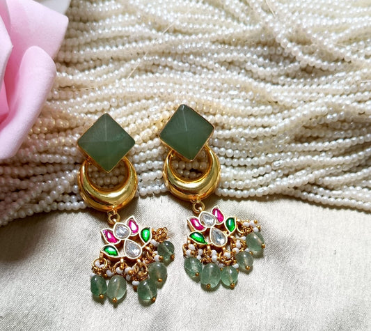 Green Stone & Kundan Lotus Chandbali Earring