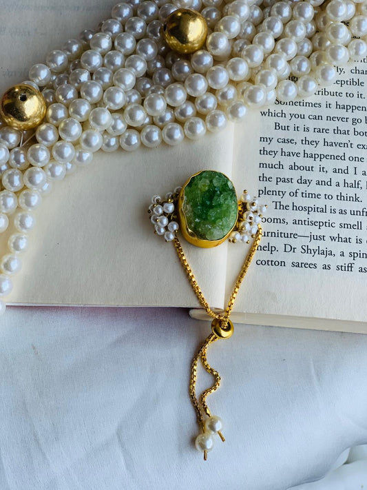 Apatite Raw Stone with Pink Druzy Pearl Studded Pendant Couple Rakhi