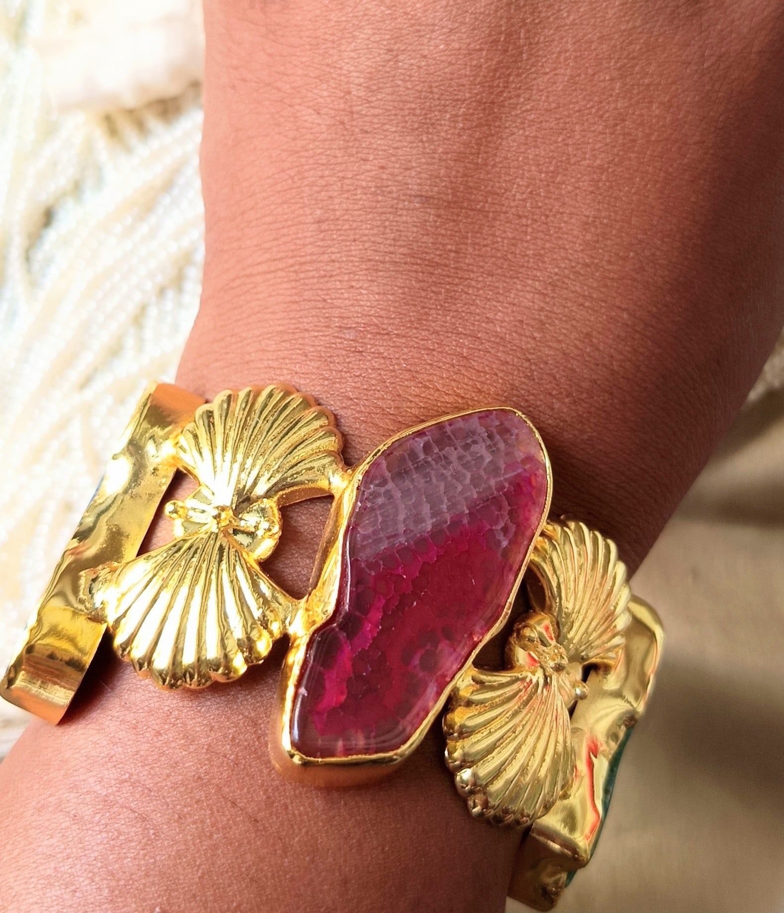 This statement handcuff is made of Agate stone with seashell that infuse positivity, joy and abundance, in brass metal with 18k gold plating.