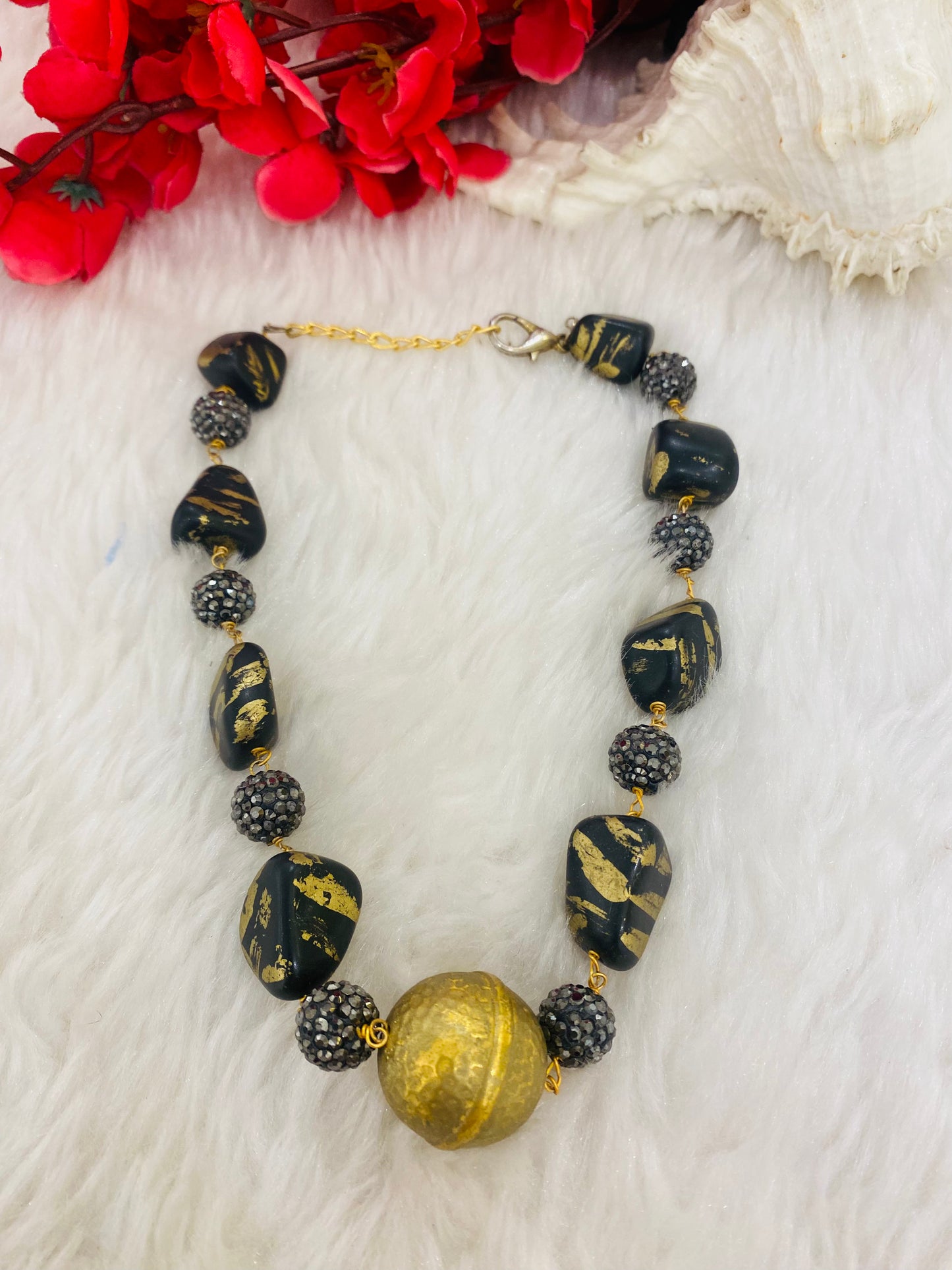 Coloured Black Onyx Stones with Pearls and Zircon Balls studded in Brass Metal Chain with 18K Gold Plating