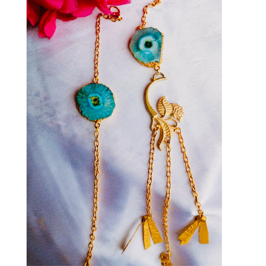 Blue Agate with Leaves Hanging in brass metal with 18k gold plating.