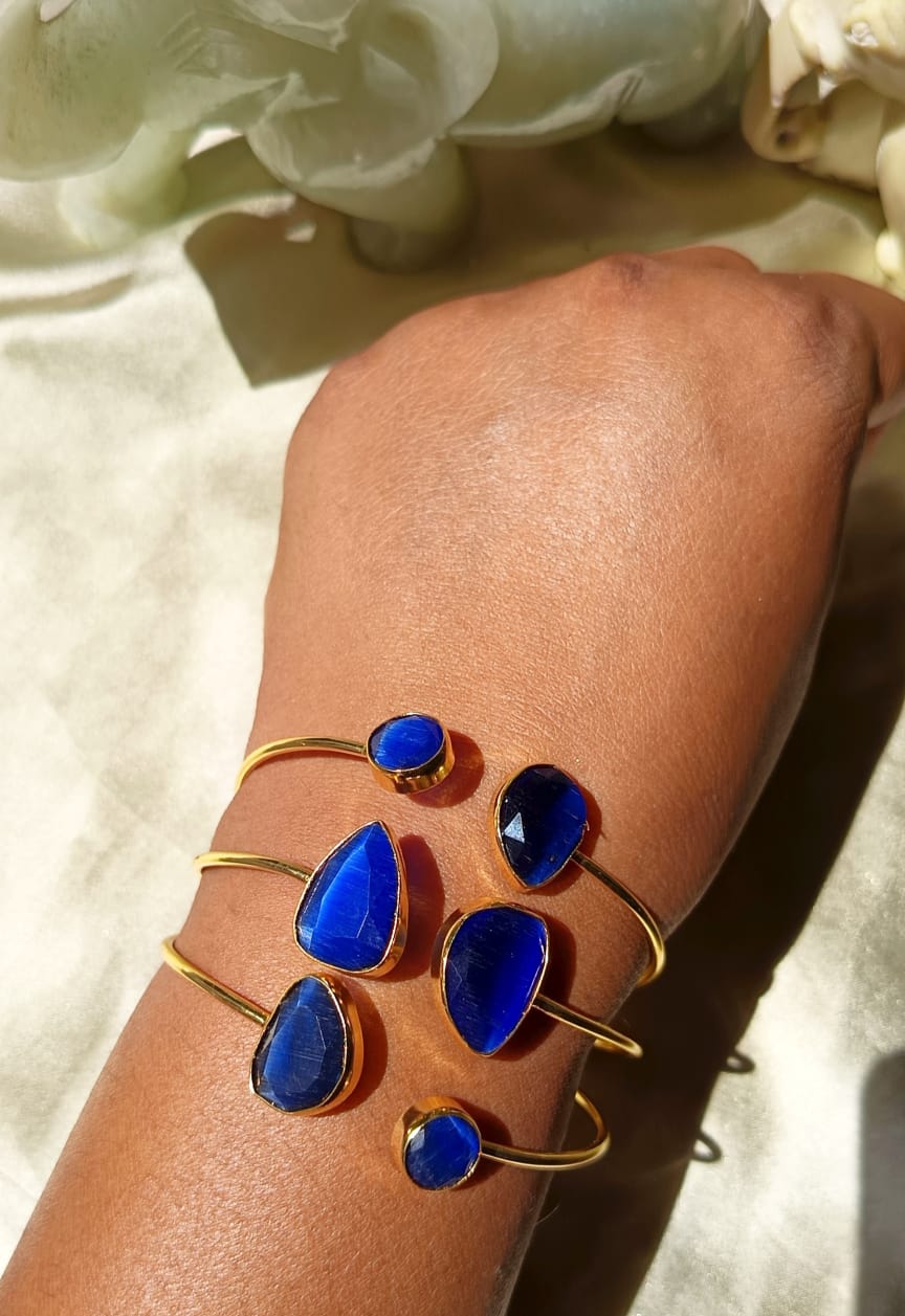 This statement cuff is made with 6 stone glass that are proven to infuse positivity , joy and abundance, in brass metal with 18k gold plating.