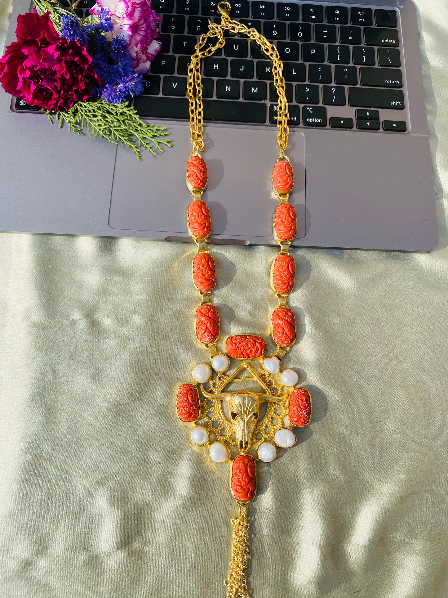 Bull Face Element with Orange Carved Coral Stones and Pearl studded in Brass Metal with 18K Gold Plating