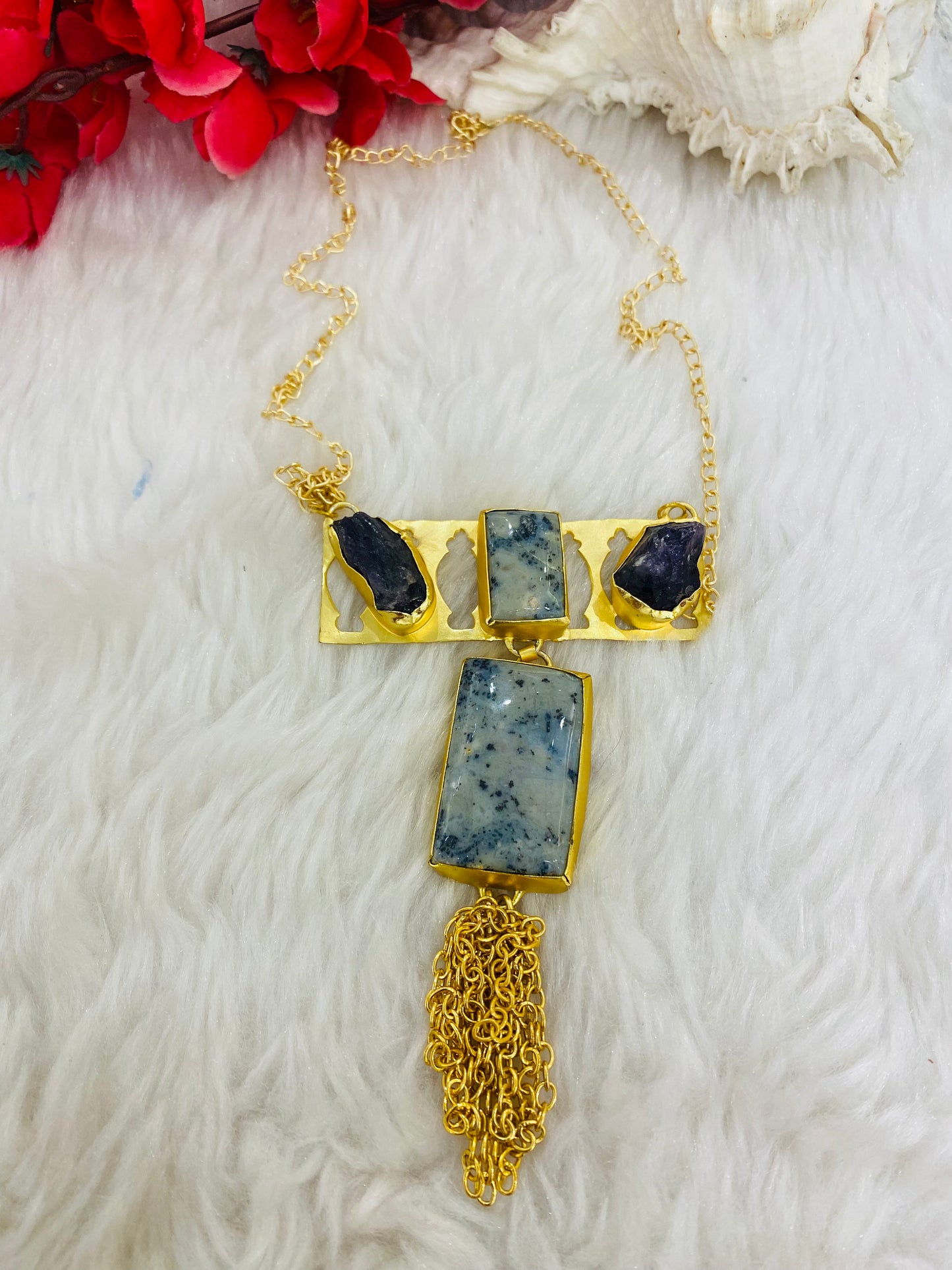 White Onyx and Rough Amethyst Stone Choker with chain tassle studded in Brass Metal with 18K Gold Plating