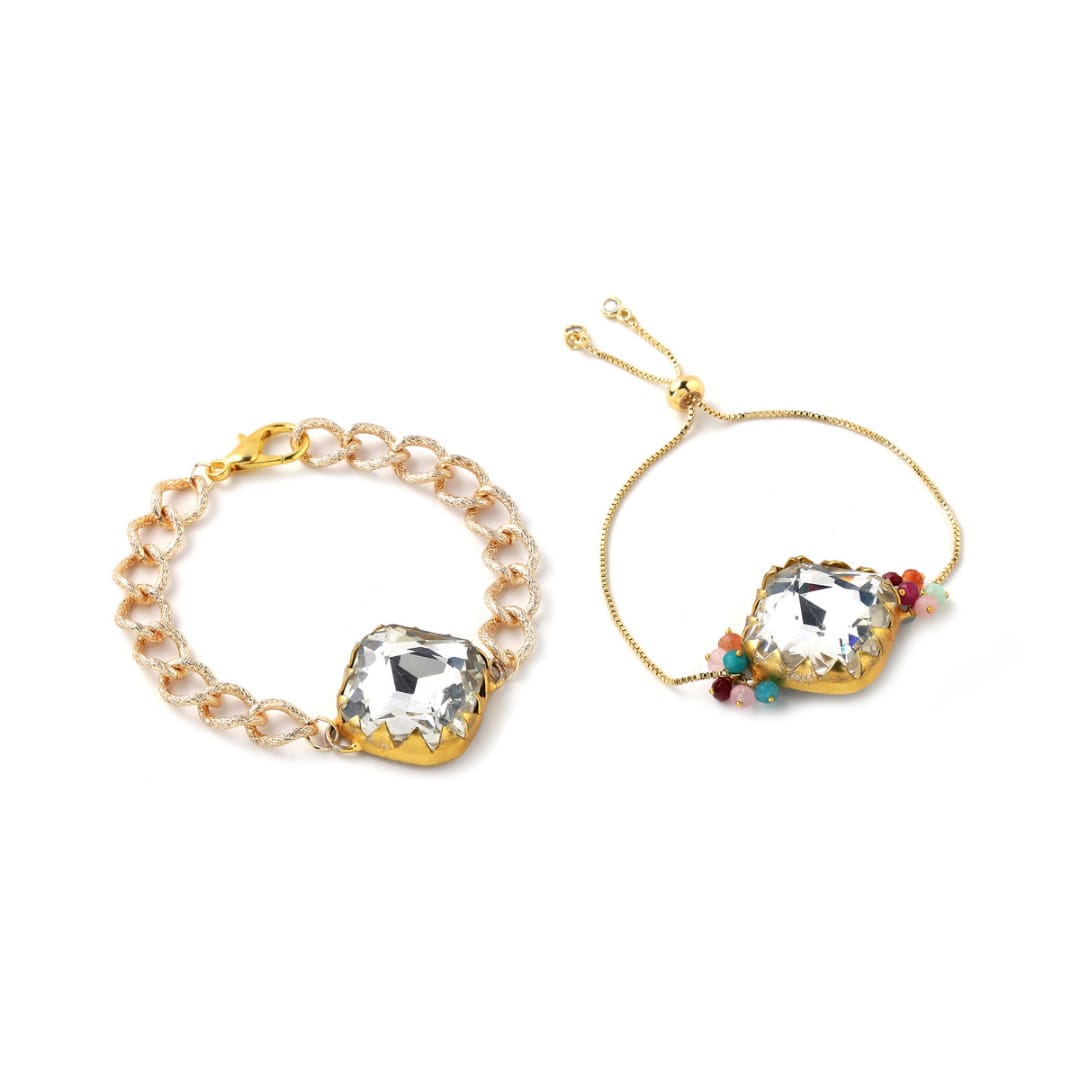 Faceted Glass Stone Bracelet in brass metal with 18k gold plating.