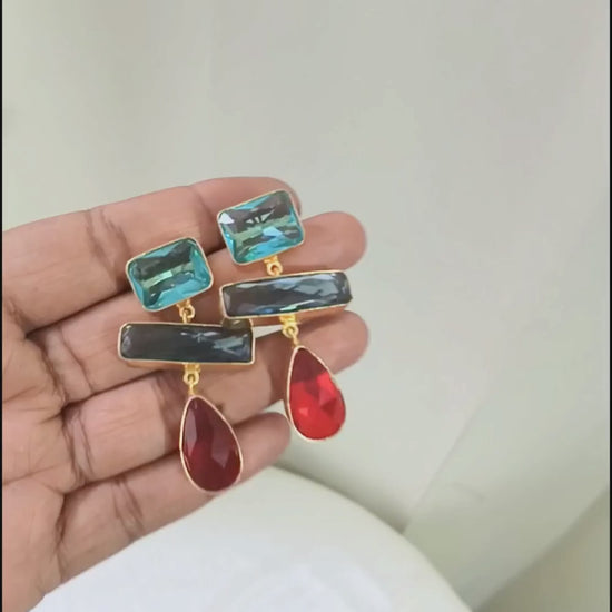 Add a touch of refined glamour to your look with these stunning multicolor gemstone drop earrings. Designed with a modern geometric arrangement, each earring features beautifully faceted stones set in a luxurious gold-plated frame. The rich contrast of vibrant reds, deep blues, and soft aqua tones creates a striking yet elegant statement.