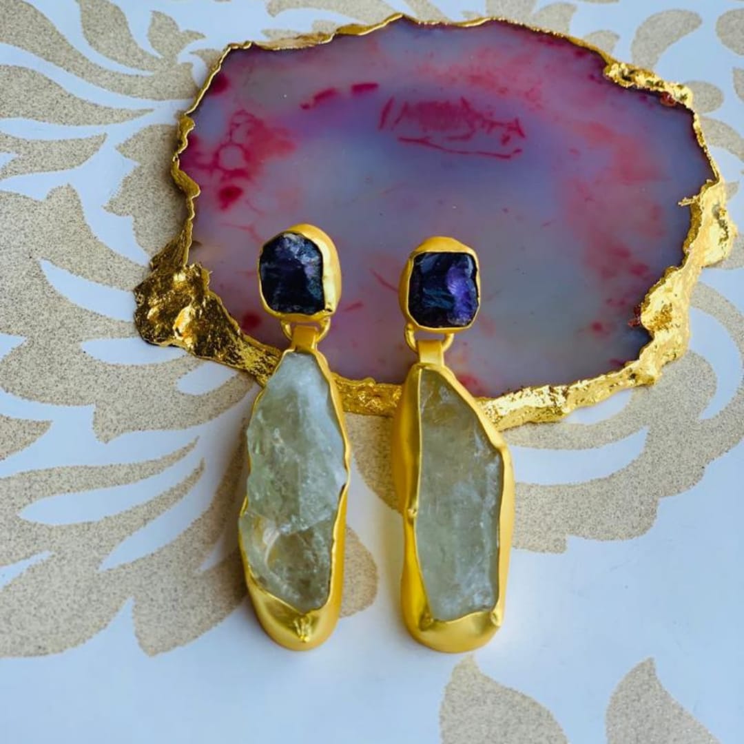 Amethyst Blue and Green rough stone earring in brass metal with 18k gold plating