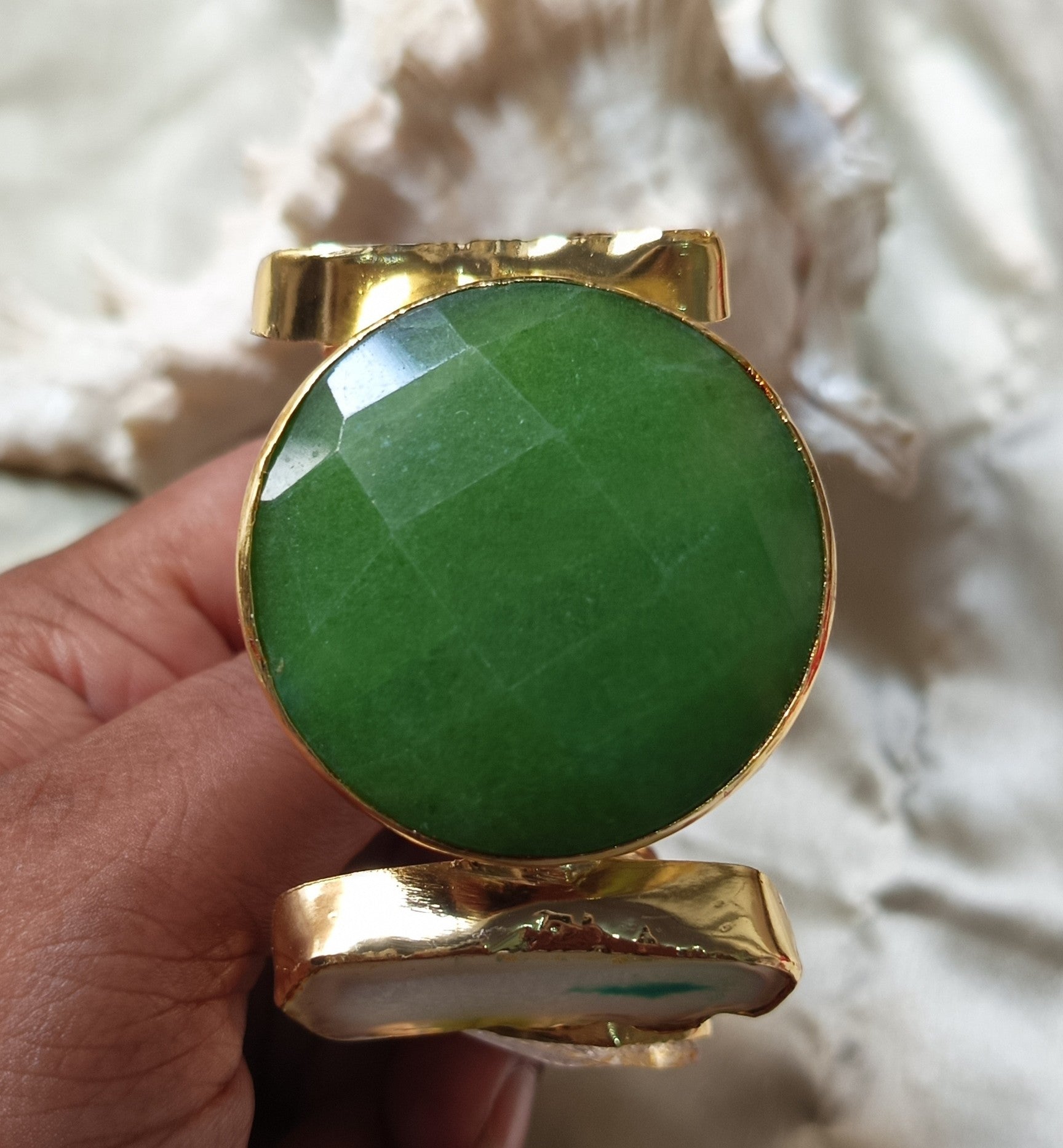 This statement handcuff is made of green aventurine white Agate stone that are infuse positivity joy and abundance, in brass metal with 18k gold plating.