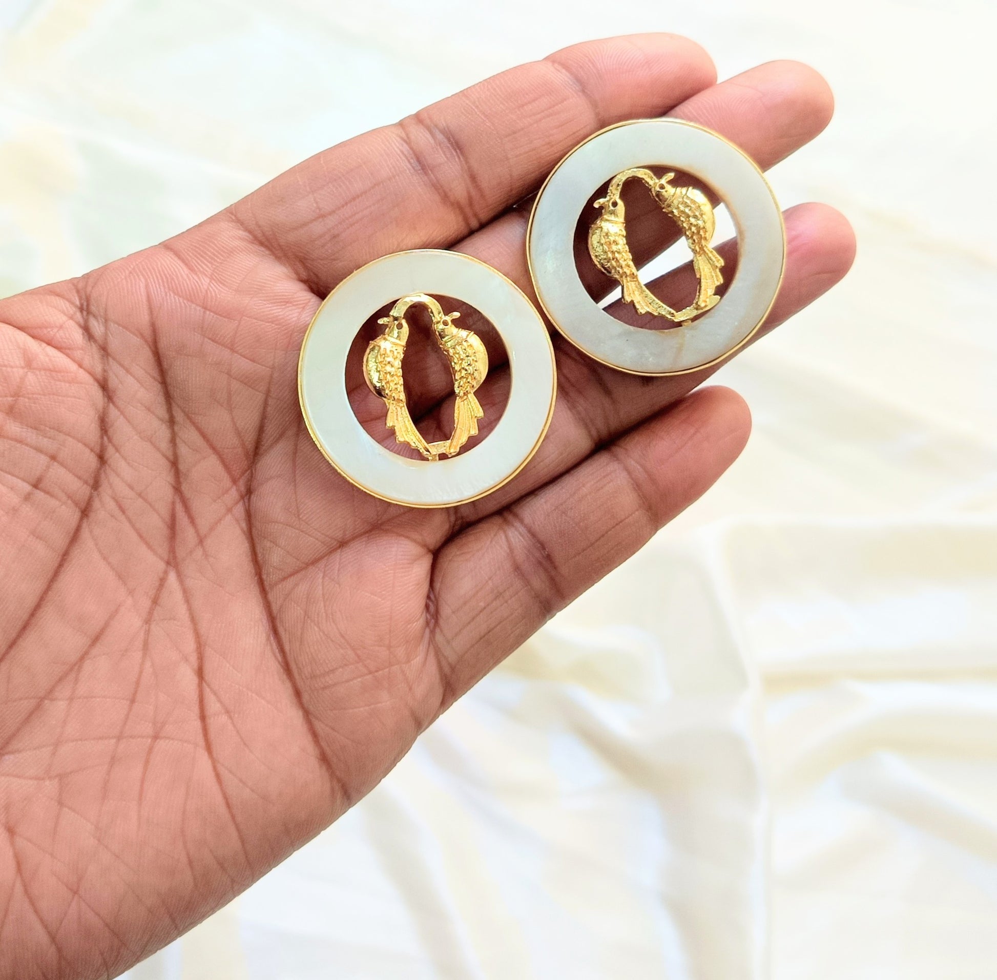 Elegant mother-of-pearl earrings with a chic gold-tone finish, offering a subtle shimmer and timeless charm. Perfect for everyday wear and special occasions.
