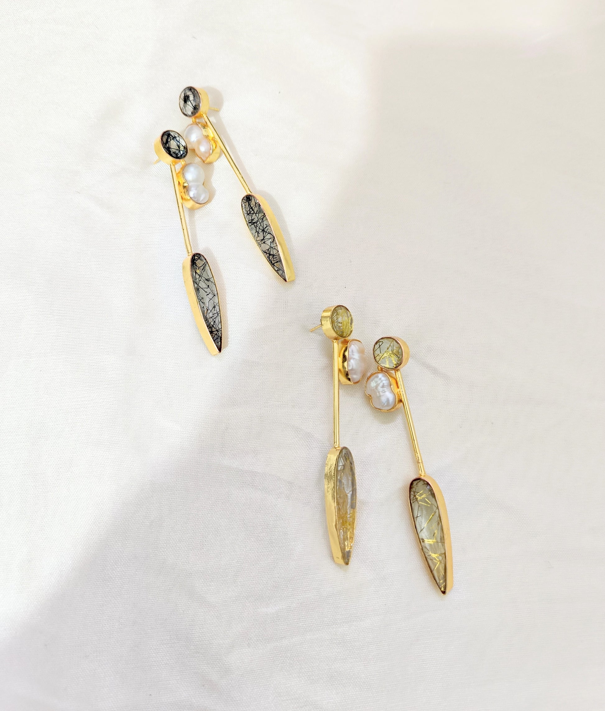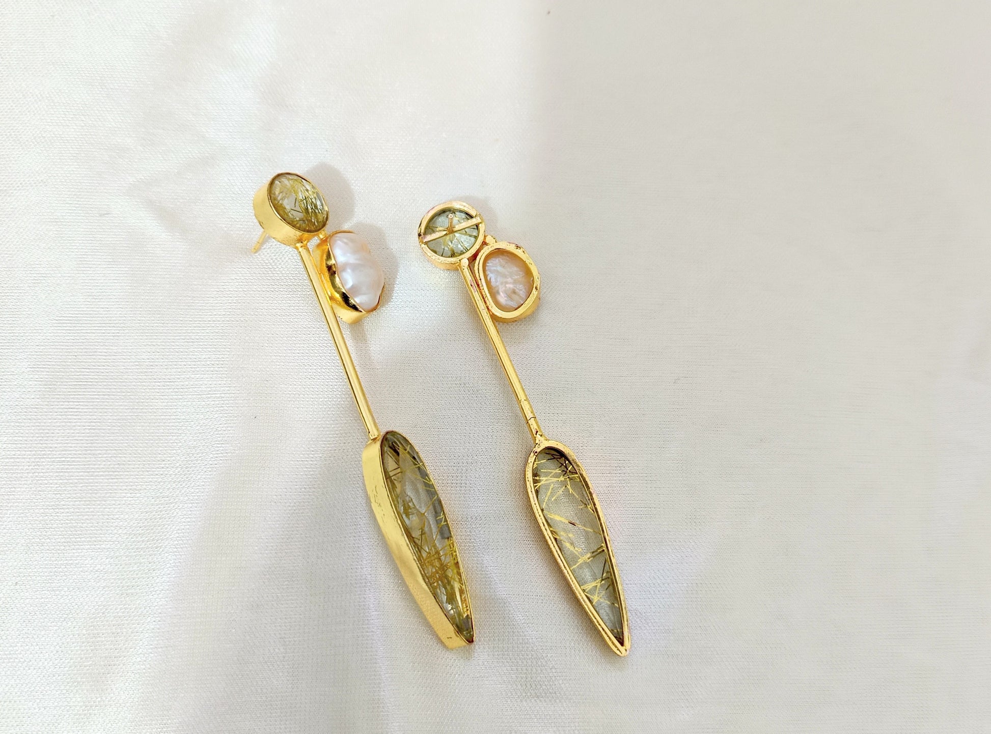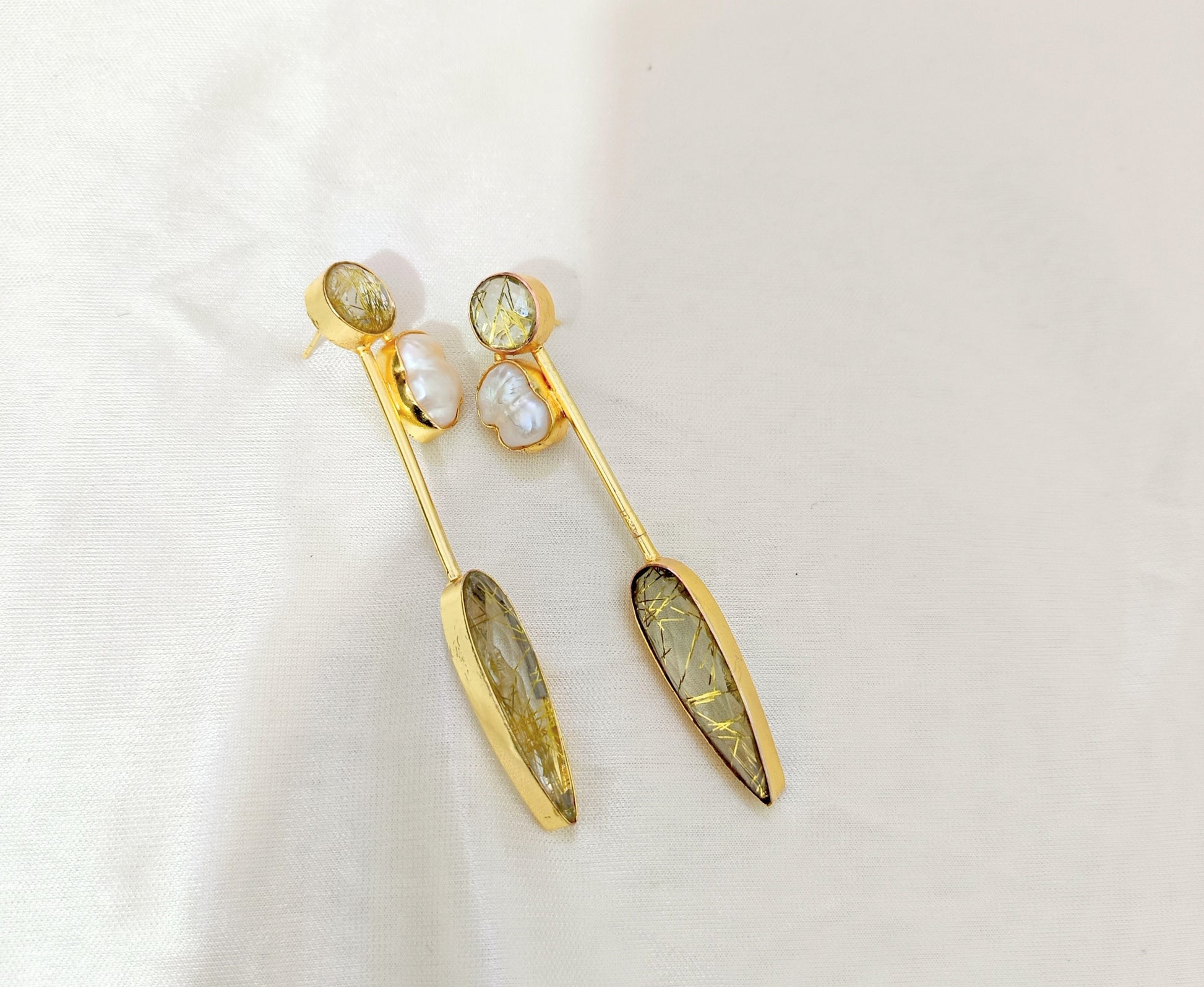 Minimalist Gold Plated Rutile Quartz Pearl Linear Earring