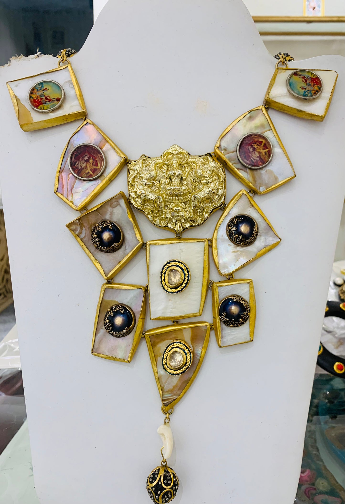 Vintage Coins and Lord Saraswati Element with MOP Shells in Brass Metal with 18K Gold Plating