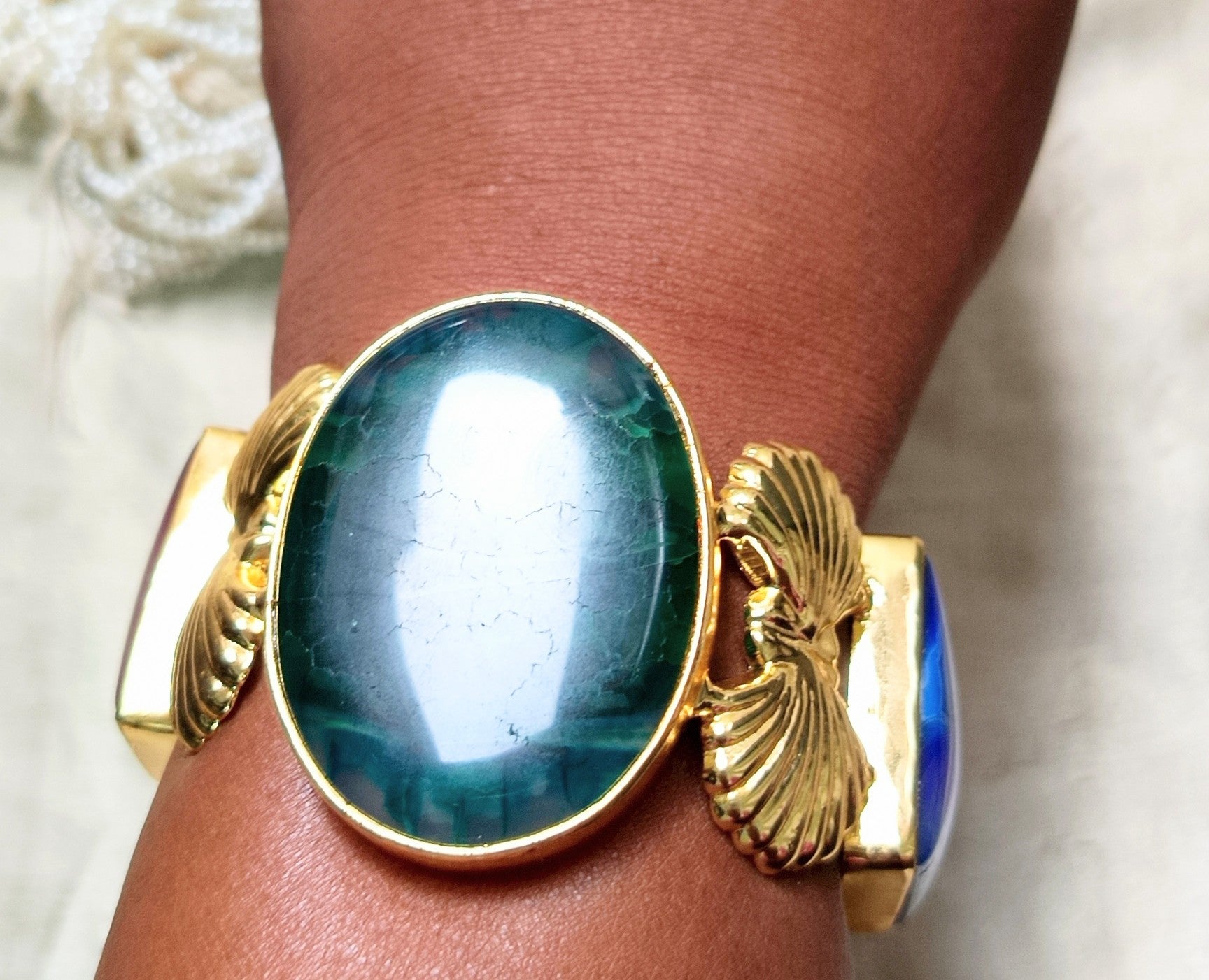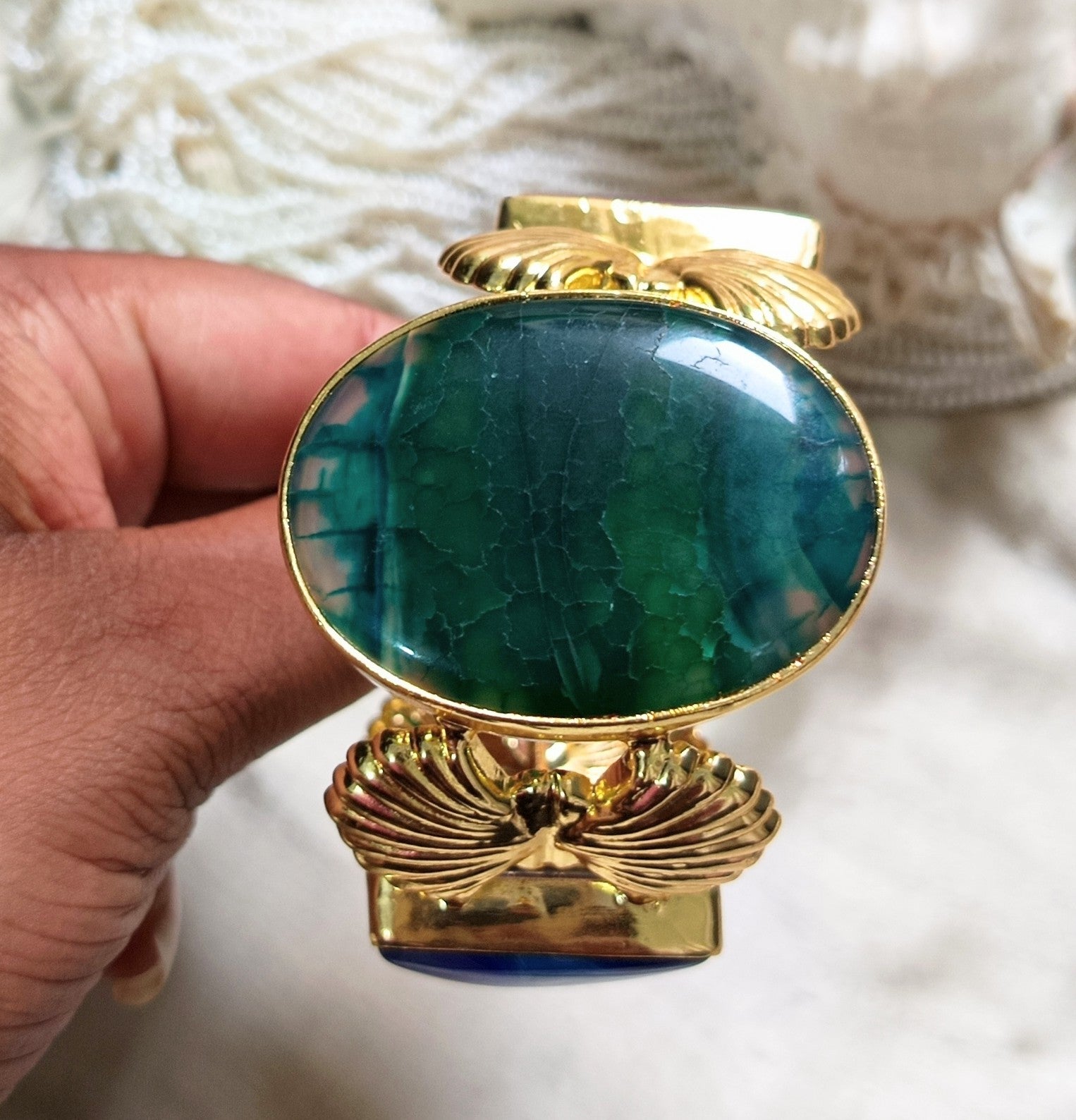 This statement handcuff is made of Agate with seashell that are infuse positivity joy and abundance in brass metal with 18k gold plating.