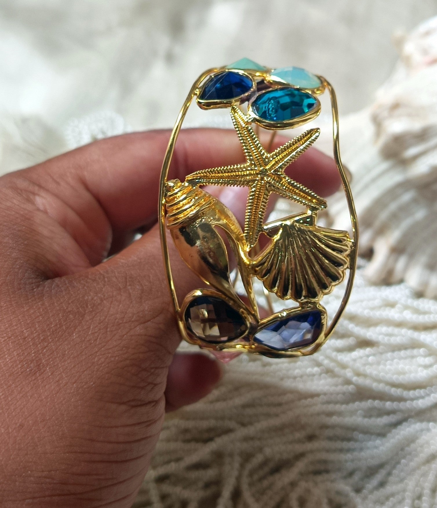This statement handcuff is made of glass stone, that are infuse positivity joy and abundance in brass metal with 18k gold plating.
