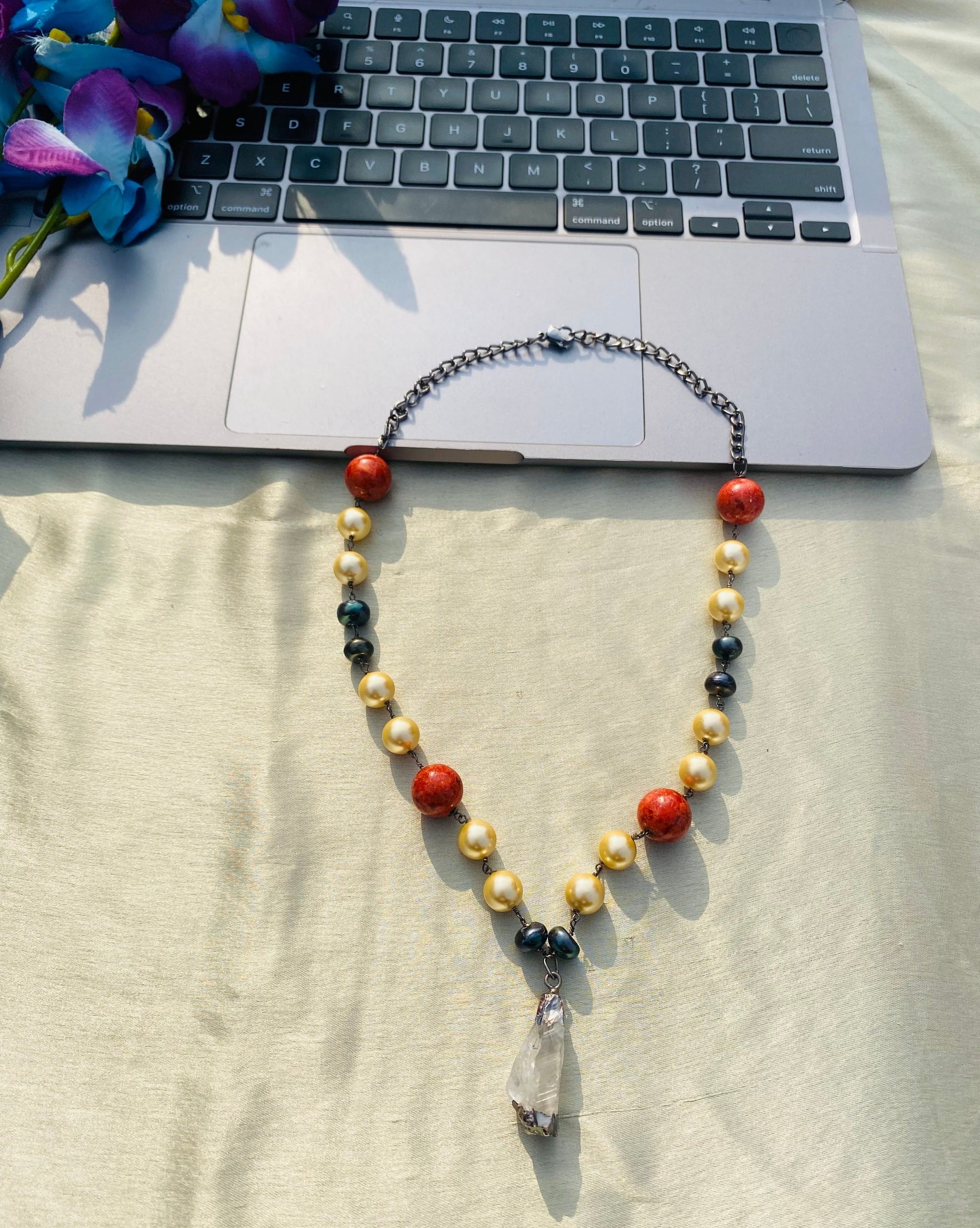 Grey, Yellow Pearl Beads with Red Coral Beads and Rough Crystal Stone Drop in Oxidised Black Chain