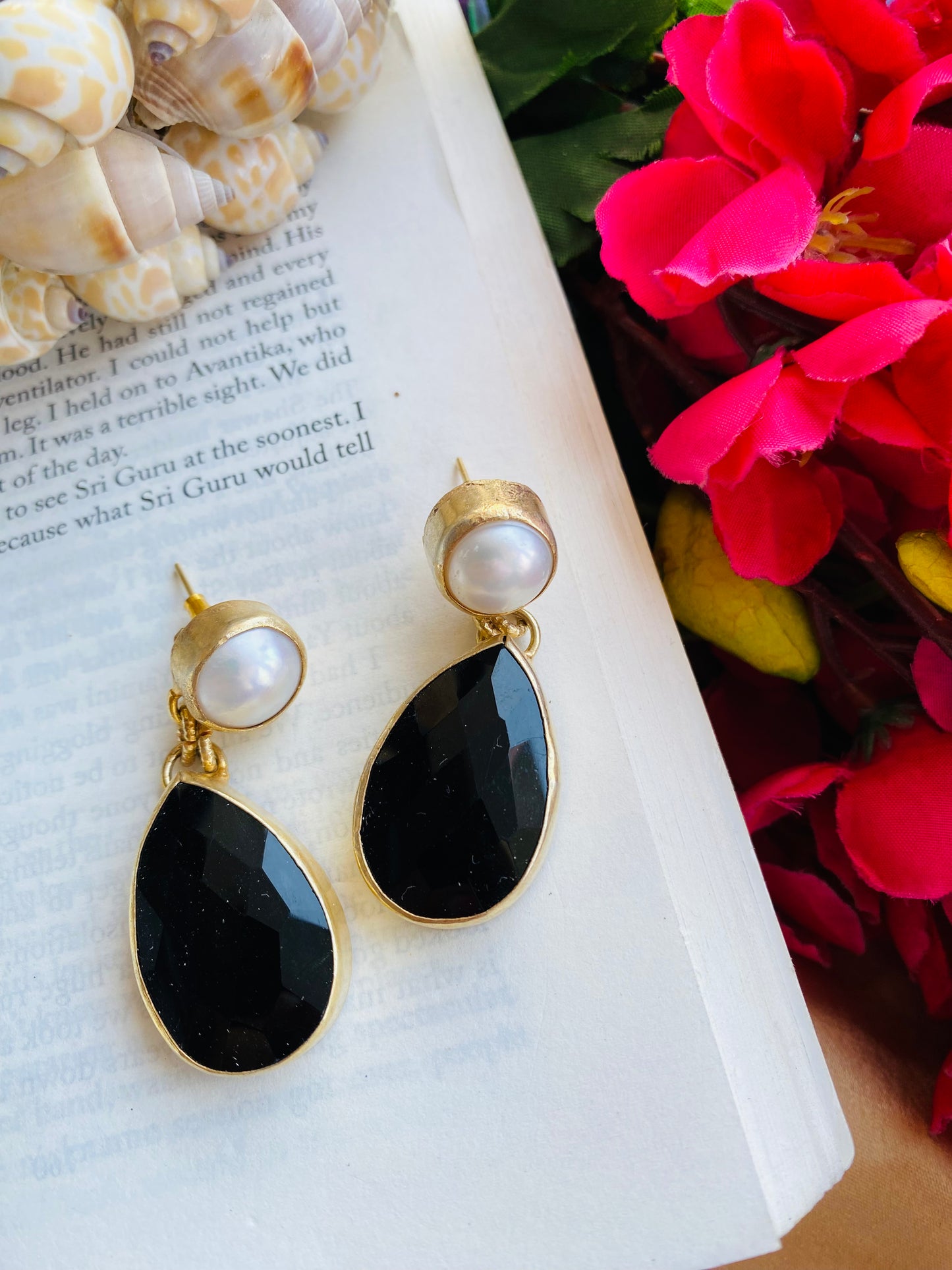 Pearl Studs with Black Onyx studded in Brass Metal with 18K Gold Plating