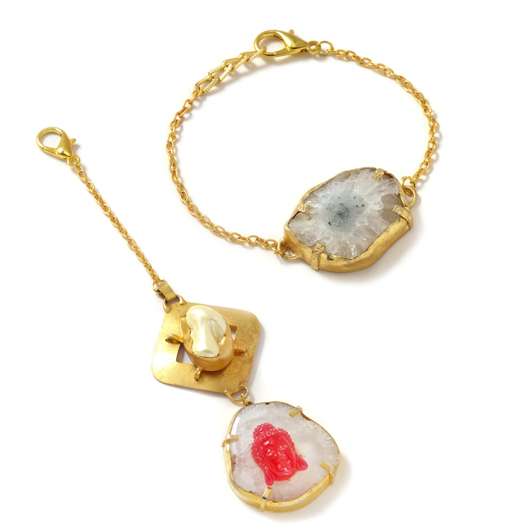 Red Buddha on Agate with Pearl couple Rakhi in brass metal with 18k gold plating.