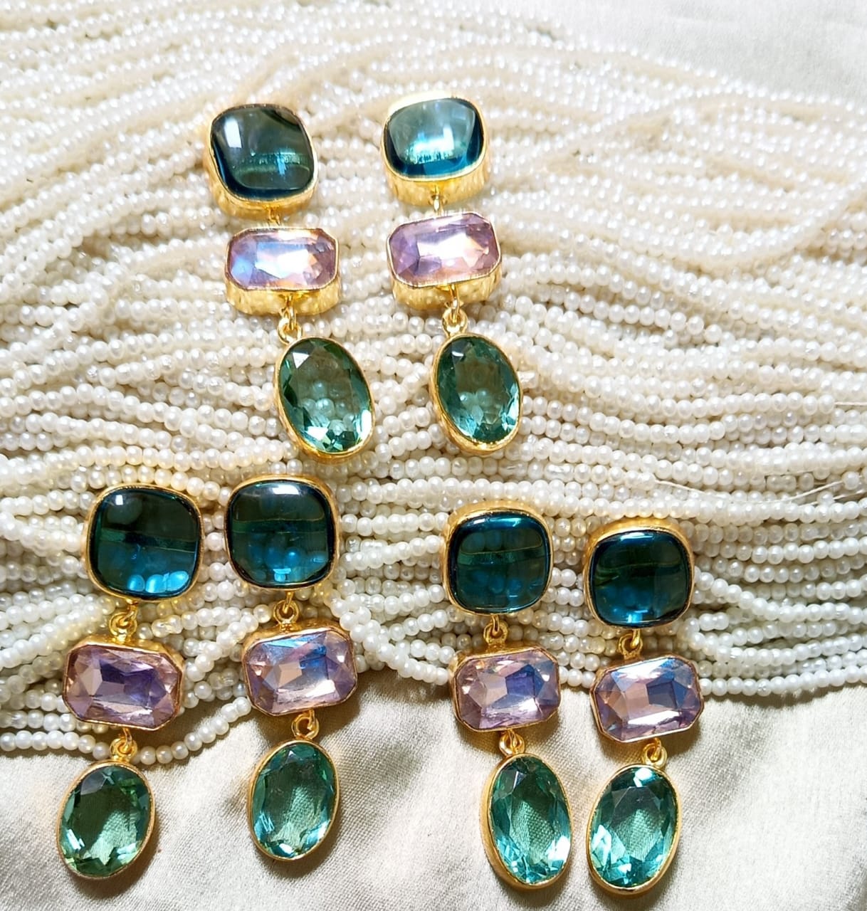 Elevate your elegance with these stunning triple-stone drop earring, crafted to bring a perfect blend of luxury , colour and timeless charm. Each pair feature three beautifully cut gemstone set in a sleek gold- plated frame, creating a graceful cascading effect that catches light with every movement.