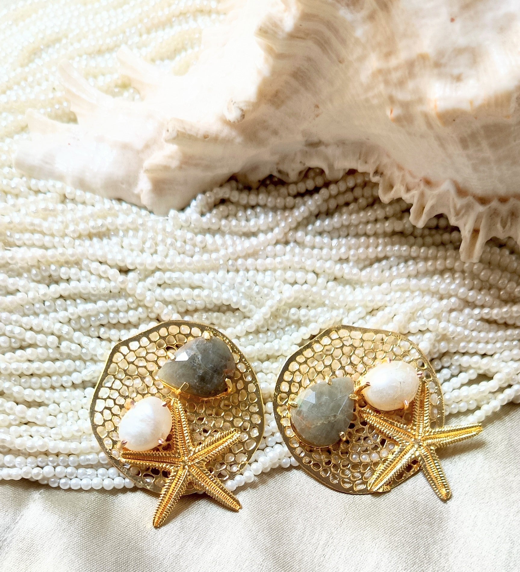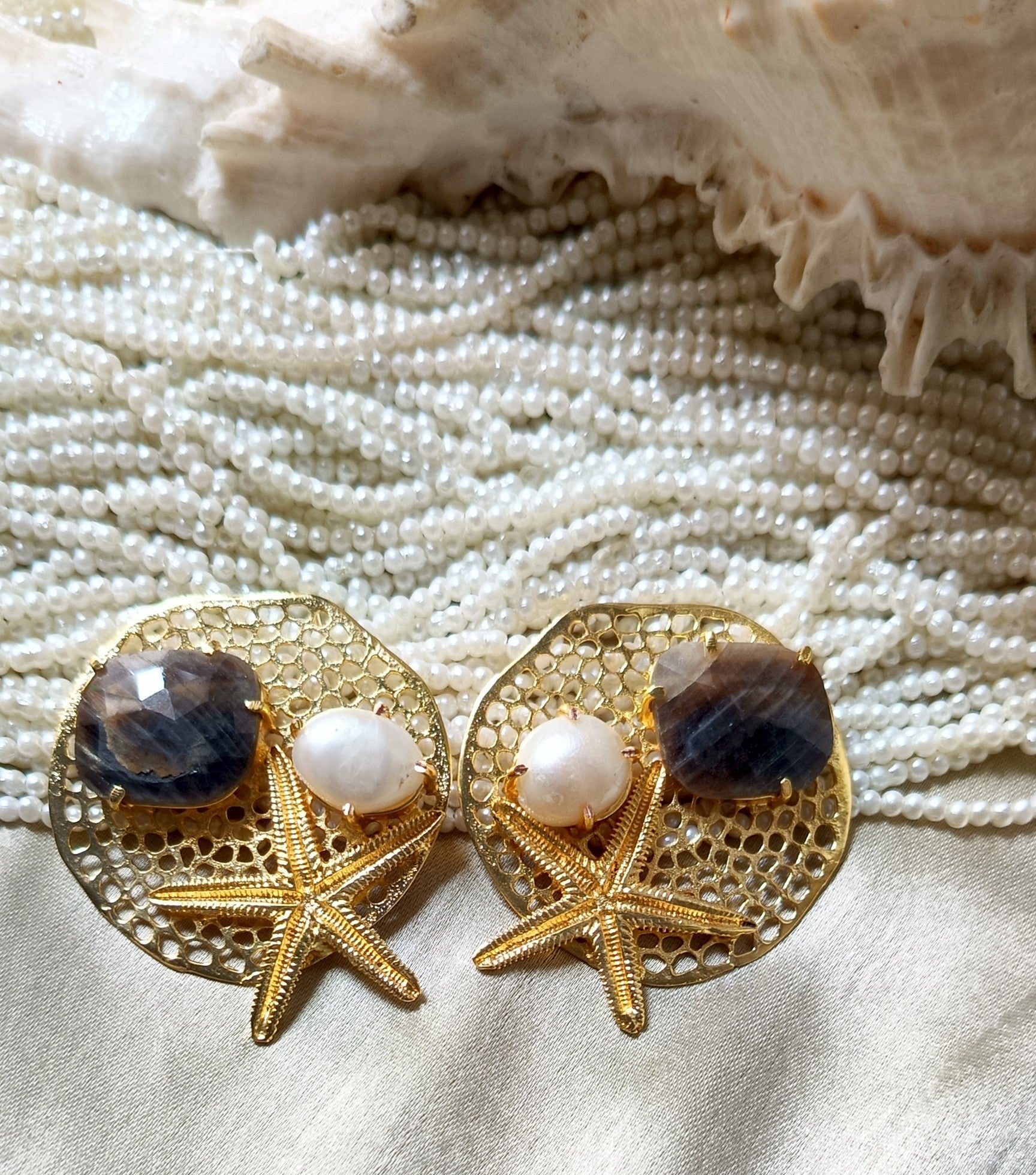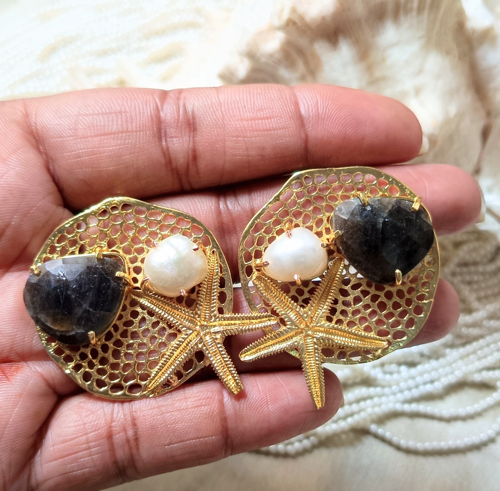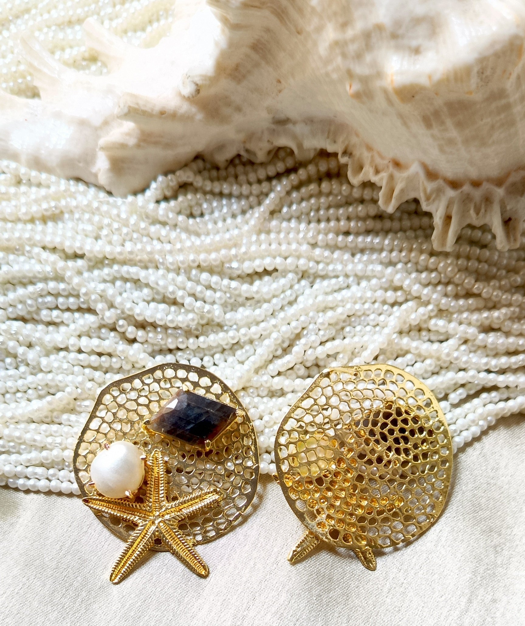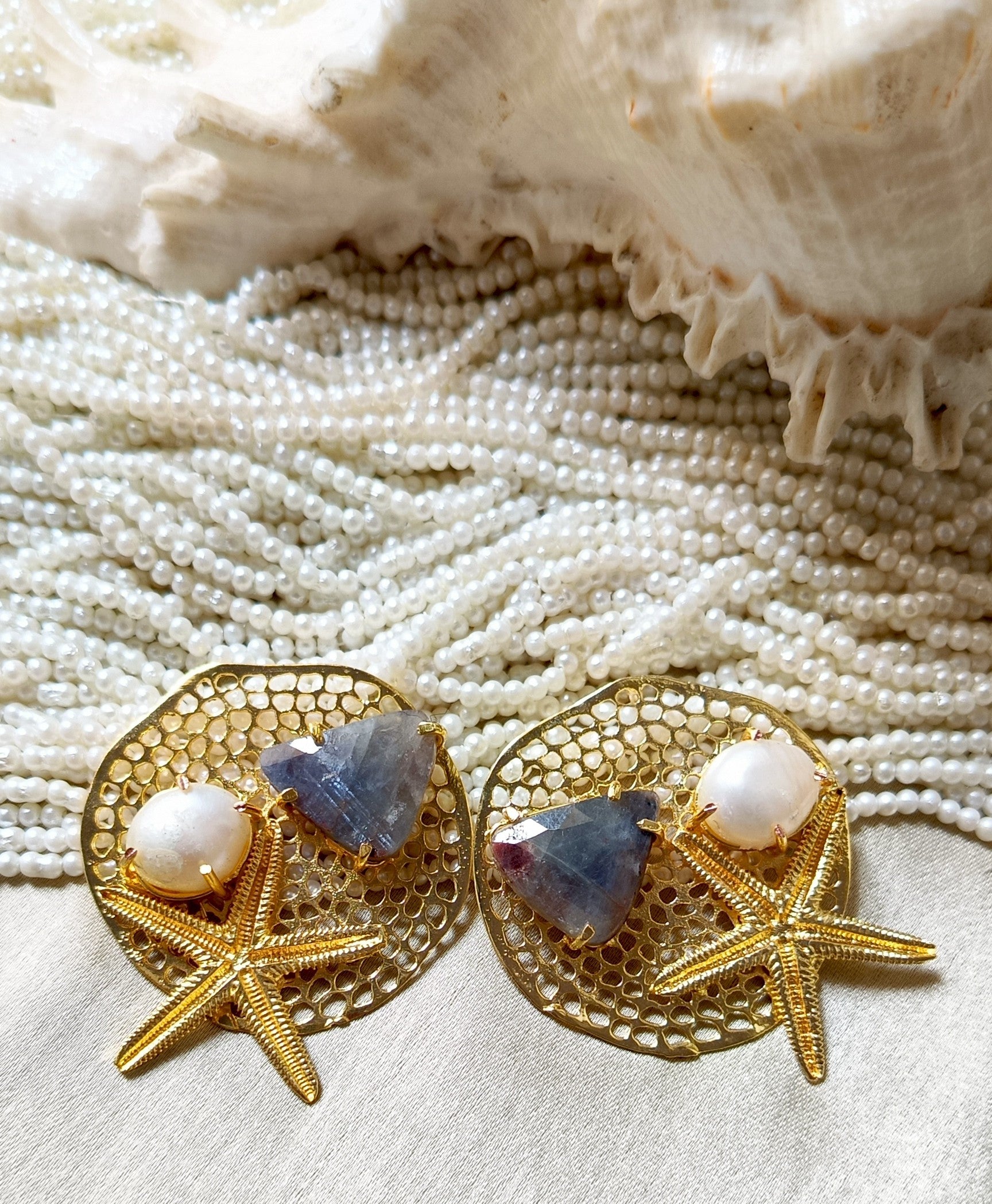 Sapphire Stone Starfish Earring , the earrings looks incredibly unique and stylish , brass metal with 18k gold plating.