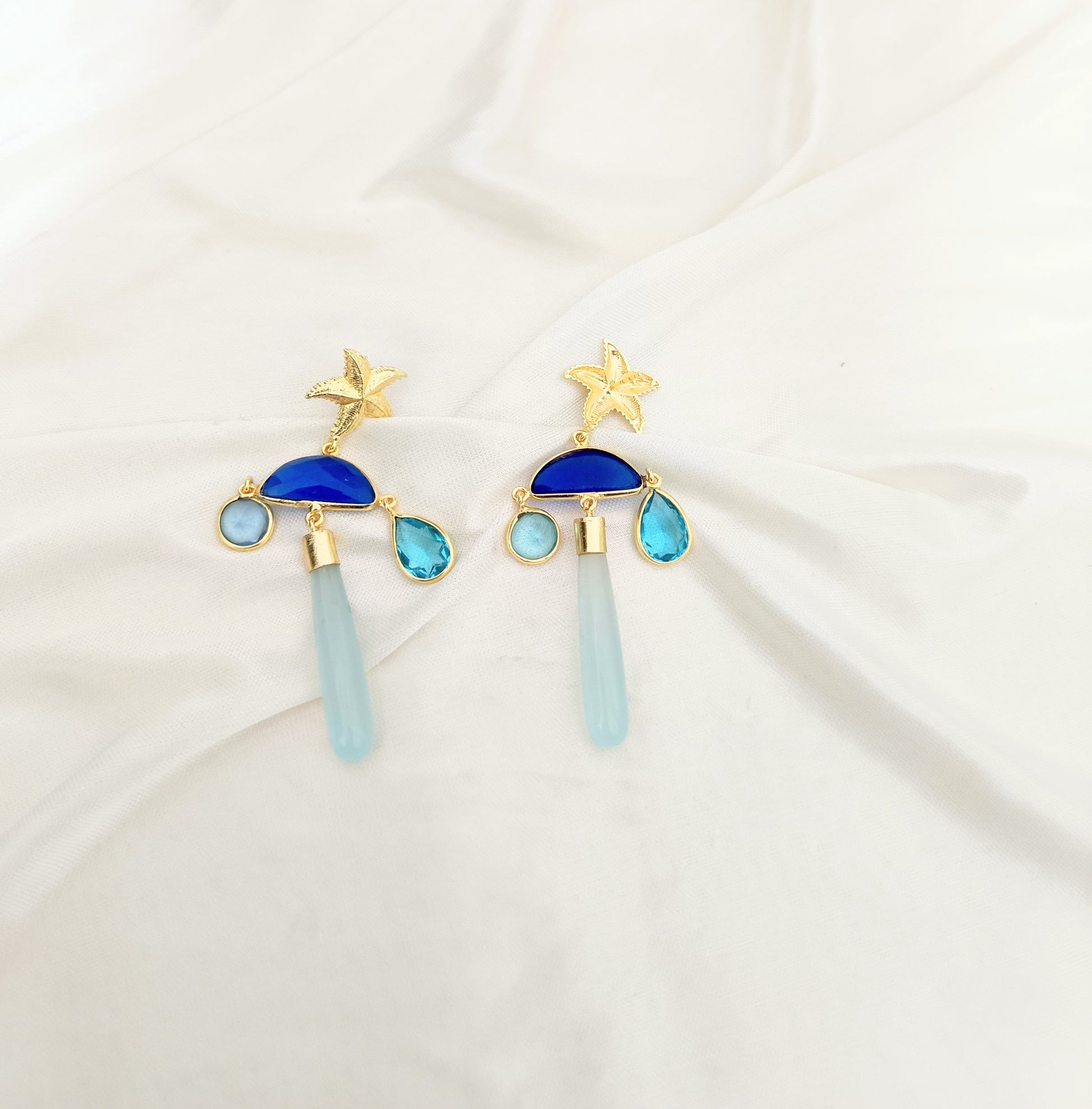 Inspired by the beauty of the ocean, these elegant statement drop earrings feature a delicate starfish stud paired with a striking arrangement of blue-toned stones. The deep cobalt crescent stone, aqua crystal drops, and a smooth elongated stone create a graceful cascading effect that adds effortless sophistication to your look.