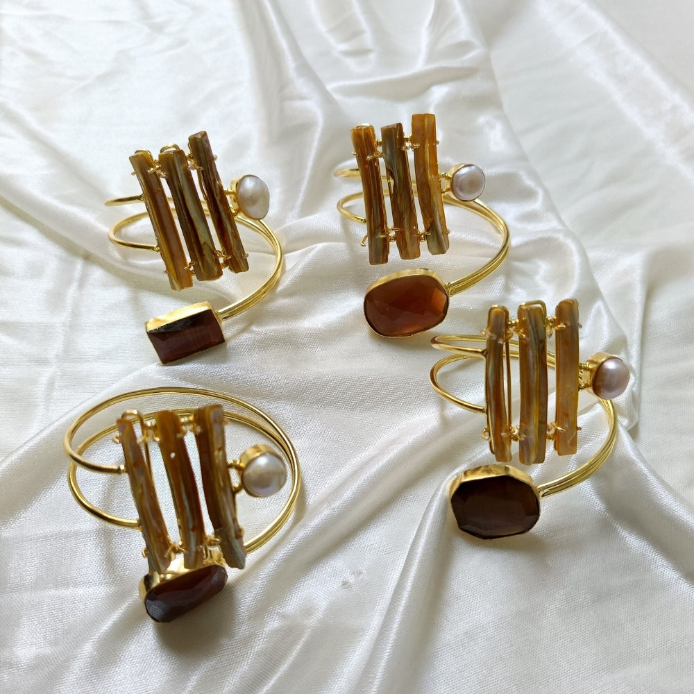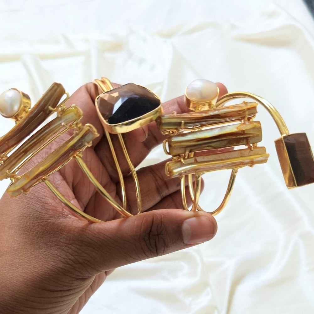 Make a bold style statement with this exquisite handcuff-inspired cuff bracelet. Designed with a striking open cuff silhouette, this piece features layered gold-tone bars accented with a luminous pearl and a faceted smoky stone, creating a perfect balance of modern structure and timeless elegance.