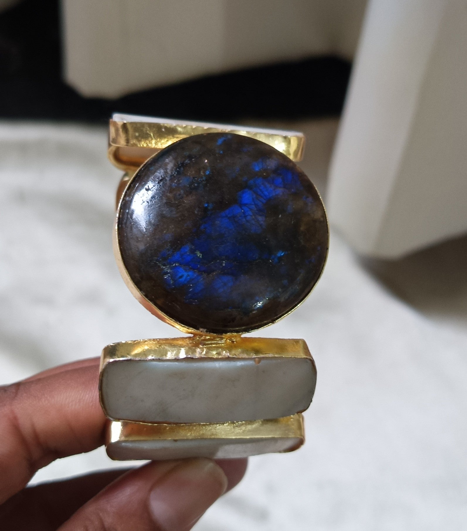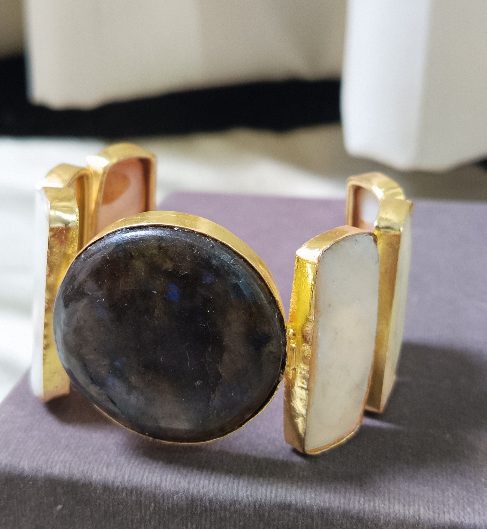 This statement handcuff is made of spectroliteb stone and pearl, that are infuse positivity joy and abundance in brass metal with 18k gold plating.